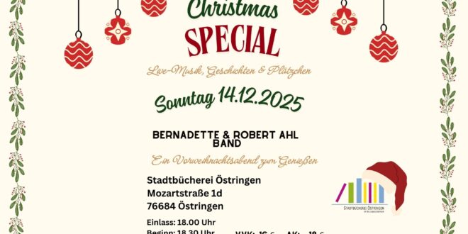 Christmas Special – Live Musik, Geschichten und Plätzchen in der Stadtbücherei Östringen Sonntag, 14.12.2025 19:30 Bernadette und Robert Ahl nehmen Euch mit ihrem Weihnachtquartett auf …