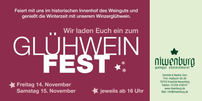 Wir laden euch ein zu unserem Glühweinfest am Freitag, 14. und Samstag 15. November 2026 jeweils ab 16 Uhr.