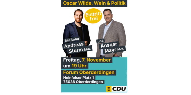 Der Landtagsabgeordnete Ansgar Mayr (CDU) lädt am Freitag, 7. November 2025, um 19:00 Uhr ins Forum Oberderdingen zu einem besonderen Abend unter dem Motto „Oscar Wilde, Wein und Politik“ ein.