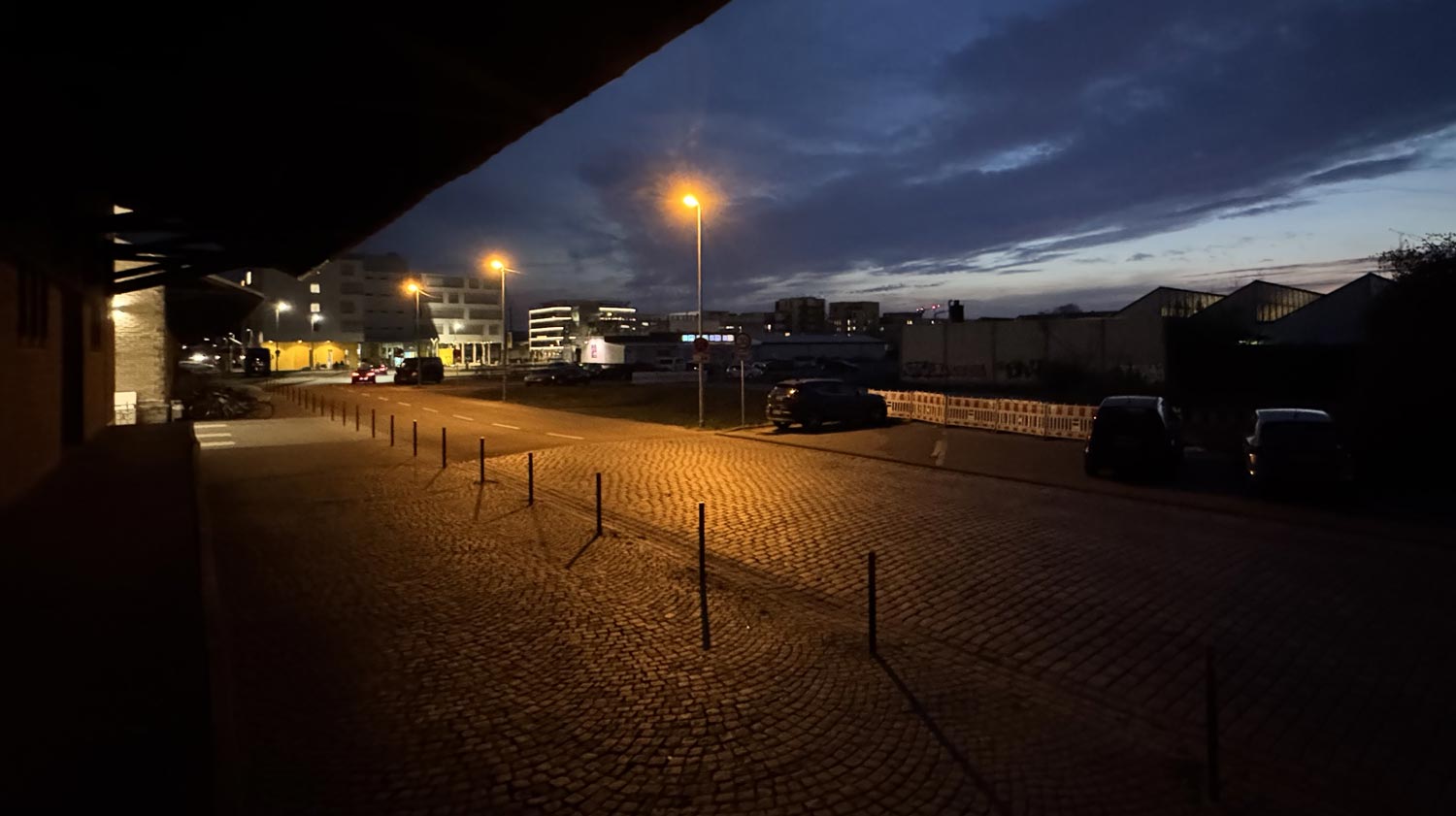 Links ab auf dem Weg zur Bahnstadt-Wohnung müssen von Heimkehrenden mehrere alte Lagerhallen, vermüllte Laderampen, dunkle Brachflächen und ein Behelfsparkplatz durchquert werden – drei Straßenlaternen werfen etwas Licht auf das Kopfsteinpflaster – dahinter versinkt die Stadt in Dunkelheit. Auf diesem etwa einhundert Meter langen Weg müssen sie vorbei an Bruchsals aktuellem Straßenstrich. Skandal im Sperrbezirk.