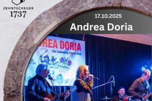 Live in der Scheuer: Andrea Doria Freitag, 17.10.2025 21:00 Zehntscheuer Am Freitag, 17. Oktober ab 19 Uhr, heißt es wieder „Live in der Scheuer“: Die …
