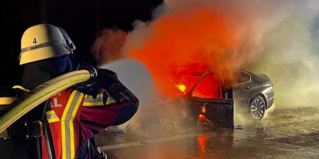 Bruchsal, 7. März 2026 | Es ist bereits dunkel auf der Autobahn, als zwischen der Notauffahrt Untergrombach und Weingarten plötzlich Rauch aus einem Fahrzeug aufsteigt. Innerhalb kurzer Zeit schlagen Flammen aus dem Pkw. Dem Fahrer gelingt es noch, den Wagen kontrolliert auf den Standstreifen der BAB 5 zu lenken. Alle Insassen verlassen rechtzeitig das Fahrzeug und bringen sich in Sicherheit.