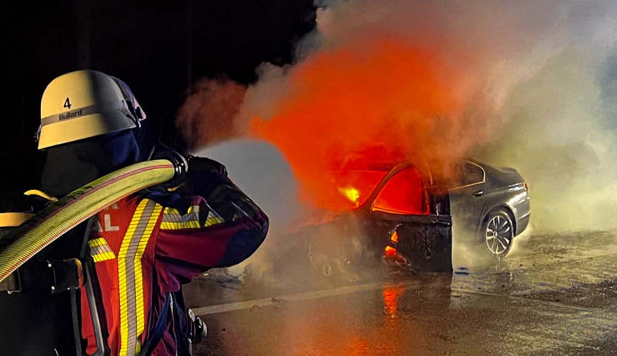 Bruchsal, 7. März 2026 | Es ist bereits dunkel auf der Autobahn, als zwischen der Notauffahrt Untergrombach und Weingarten plötzlich Rauch aus einem Fahrzeug aufsteigt. Innerhalb kurzer Zeit schlagen Flammen aus dem Pkw. Dem Fahrer gelingt es noch, den Wagen kontrolliert auf den Standstreifen der BAB 5 zu lenken. Alle Insassen verlassen rechtzeitig das Fahrzeug und bringen sich in Sicherheit.