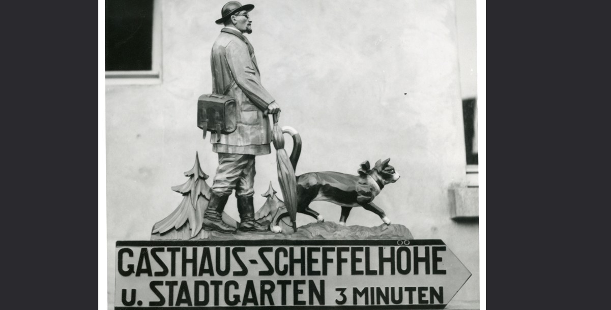 Bildunterschrift: Dieser historische Wegweiser führte vor 1945 Besucher vom Schloss Bruchsal hinauf zur neben dem Stadtgarten gelegenen Gaststätte „Scheffelhöhe“. Er zeigt Scheffel und den Kater Hidigeigei.