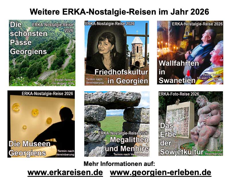 Begleitet werden diese besonderen Reisen vom Kaukasus-Experten, TV-Journalisten und Buchautor Rainer Kaufmann, der Georgien seit den frühen 1990er-Jahren kennt. Neben Besichtigungen und persönlichen Begegnungen vor Ort wird es Raum geben für gemeinsames Erinnern: Filme, Fotografien und Zeitungsartikel aus dem umfangreichen Archiv von ERKA-Reisen werden gezeigt, diskutiert und in ihren historischen Kontext eingeordnet.