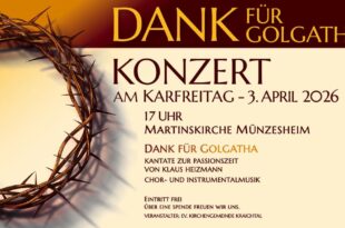 Konzert des Evangelischen Kirchenchors Münzesheim am Karfreitag Freitag, 3.4.2026 19:00 Der Evangelische Kirchenchor Münzesheim lädt herzlich zum Karfreitagskonzert am 3. April 2026 um 17 Uhr …