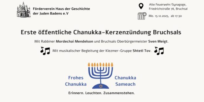 Am 15.12.2025 veranstaltet der Förderverein „Haus der Geschichte der Juden Badens“ e.V. mit Unterstützung der Stadt Bruchsal die erste öffentliche Chanukka-Kerzenzündung in Bruchsal. Der Rabbiner Mordechai Mendelson aus Karlsruhe und Bruchsaler OB Sven Weigt halten kurze Ansprachen. Für die musikalische Begleitung sorgt die Klezmer-Gruppe Shtetl Tov aus Bruchsal.